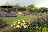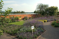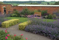 The north border has a more contemporary feel with a zig-zag box hedge and block plantings of different coloured Lavenders.