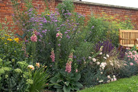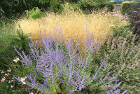 The main east border, backed by a lovely old red brick wall and sub-divided by buttresses of yew, consists of a mix of herbaceous perennials, bulbs, grasses and shrubs. An Amelanchier canadensis tree, with an underplanting of Hellebores, has been planted at the northern end of this border which should give good spring blossom and autumn colour. Clematis and rambling roses will eventually clothe the wall.