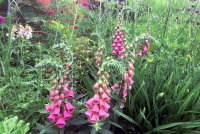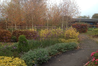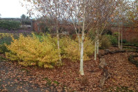 The final border is deep and has block plantings of hornbeam hedge, box balls and coloured-stemmed Dogwoods. Behind these is a woodland walk through a small forest of Silver birch.