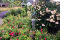 The west border is in fact two matching borders divided by the entrance into the garden. The Euonymus 'Emerald 'n Gold' hedging either side of the entrance being all that was left of the original garden. These two borders have a purple theme with Nepeta 'Six hills giant' and Verbena bonariensis prominent.