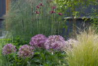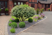 The final image shows the front garden with new plantings of box, yew, lavender, miscanthus grasses and alliums surrounding an existing Eleagnus shrub which has been pruned and shaped.