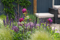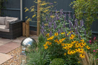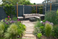 The planting is a mix of shrubs, perennials and grasses, including roses, salvias, box and Mexican feather grass. Two evergreen star jasmines climb the fencing behind the seating, their white flowers giving off a wonderful fragrance in June and July. A sail shade gives protection from the midday sun.